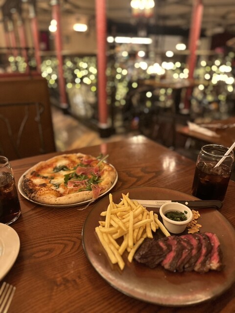 ステーキですが、ソースとお肉の相性が良くて、すっごく美味しかったです。ピザに関しても、生ハムとルッコラが相性抜群で大満足でした。また、店内の雰囲気が陽気なのでとても居心地が良かったです。個人的に2階席が好みだったので、予約の時に言っておくとBESTだと思います。Birthdayプレートも可愛いし、店内の演出も良かったのでぜひまた利用させて頂きたいです♥️
