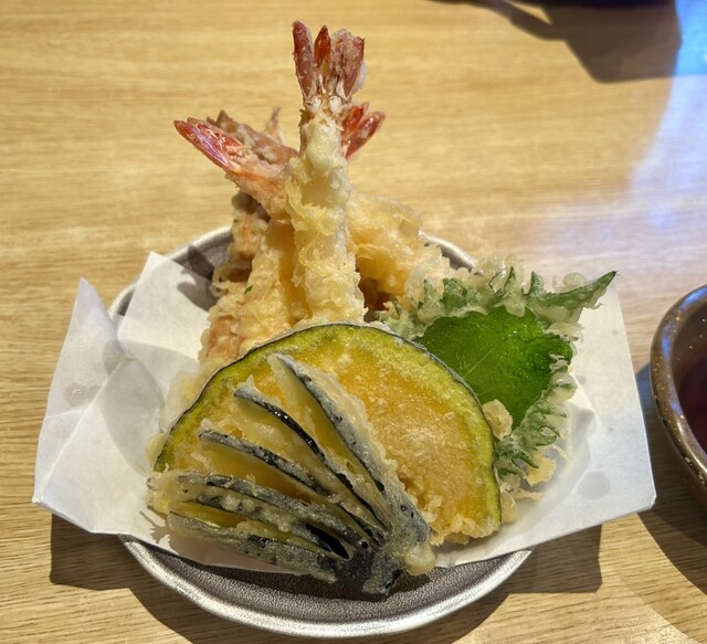 天ぷらは天つゆで頂いたり 釜玉の終盤に貰える 出汁割(お出汁)を 残りうどんに掛けたものと一緒に天ぷらをいただくのも 美味しかったです。