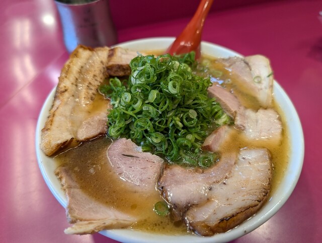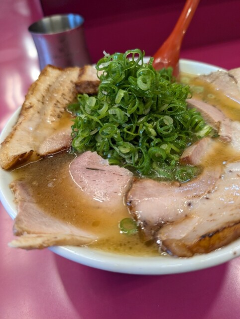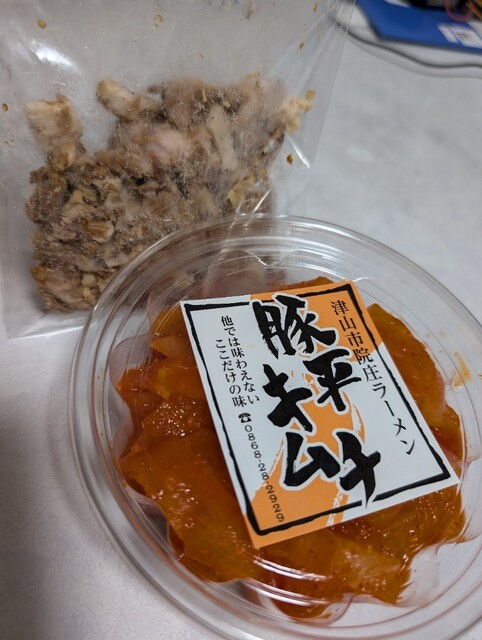 岡山県北部の津山、院庄インターチェンジ降りてすぐの「豚平」さんへは、仕事の都合で年間2回、春と秋に訪問しています。今日は午前中の仕事を終えて13時過ぎに行くと店外には20名程の行列が。今日は風も強く寒い中1時間待って店内に入りました。ちょうど14時閉店ということでギリギリセーフ。チャーシューたっぷりの豚平は売り切れで、ラーメン、ラーメン定食(ラーメン、ごはん、キムチ)、餃子がオーダー可能ですとのこと、ラーメン定食950円と餃子450円を注文しました。店主さんが「寒い中待ってくれていたから、チャーシュー多め、餃子も多めに入れておきますね」「風邪予防にネギもたっぷり入れておきますね」「地元鏡野町産のお米です」「地元特産の唐辛子で作った胡椒」「口直しに紅茶をどうぞ」等々の言葉をいただきました。パリパリの餃子、つけダレ、唐辛子につけて、先ずは全てごはんとキムチと完食してから、濃厚醤油ベース豚骨のラーメンも一気に完食、完飲しました。最後に紅茶を口直しにゴクリ飲んでサッパリしました。「チャーシュー切れ端をビールと一緒におつまみに」と言っていただきました。キムチも美味しかったので、持ち帰りでキムチ1 パック600円を買って帰りました。店主さんの心温まる言葉、ラーメンを作る仕草、お客様に対する接待の素晴らしさが、味も最高‼️気持ち良い接待で心温まる最高‼️全て最高な豚平さんへみなさんもぜひ食べに来てください。県外ナンバーの車も多く人気店の秘密がわかったような気がしました。また半年後行くのが楽しみです