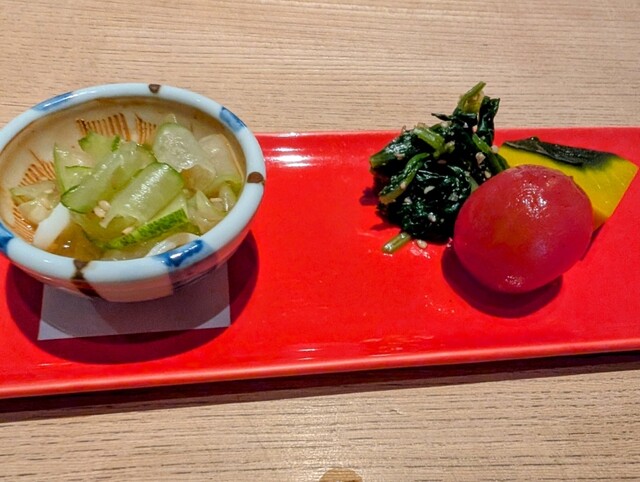 秋風が心地よい夕暮れ時、西川沿いにあるビルの階段を3階まで上がって店内に入るとカウンター、テーブル、座席の全てに無垢の木材が使われていて、壁面にはガラス、格子などがあり、壁、床は土と石が用いていて、店内を心地よい自然な空気が包み込まれていました。食材にとことんこだわった身体に優しい天然の素材を使用したやさしい食事とお酒を楽しみました。