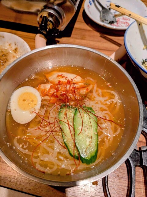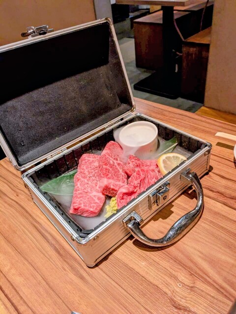 コースが始まりましたら、最初にジェラルミンケースが運ばれてきて、開くとドライアイスの中から現れた肉の盛合せは見た目からワンランク上の上質な肉でした。焼いた肉にわさびを乗せて食べると、口の中でとろける肉質で最高でした。予約していた半個室、店内の雰囲気も良く、多くのお客さんでいっぱいでした。外国人のお客さんも多く、人気店を実感させました。皆さんもぜひ食べに来てください。オススメします‼️