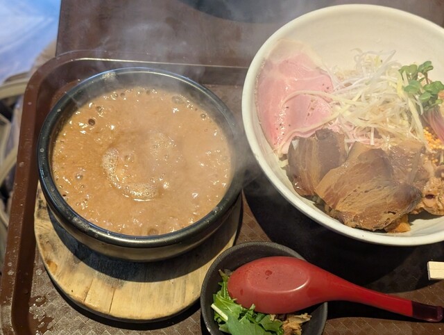 友達のつけ麺は、グツグツ煮立つ汁が、