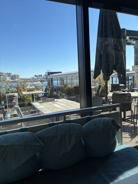 店の入口前は広い芝生で、店内の窓からは海が見え、案内されたソファー席もカラフルでテンション上がりました。