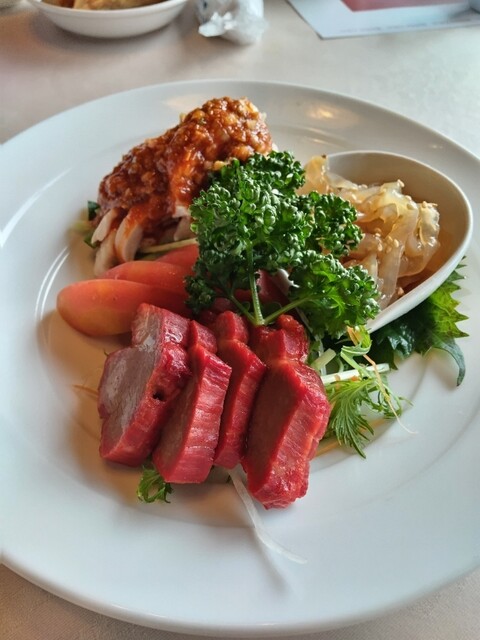 ★特製叉焼・蒸し鶏・クラゲ三種盛り合わせ(2,500円)···蒸し鶏にかかっているタレが絶妙にうまい。前菜としてパーフェクトな一品です。
