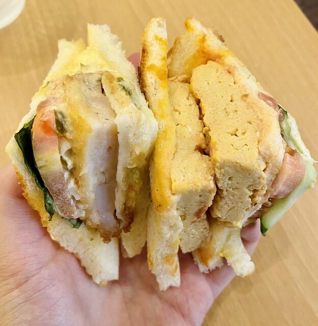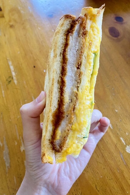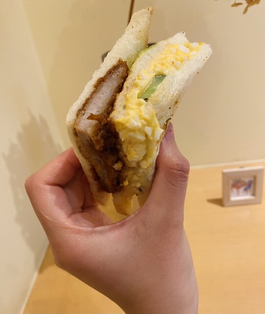 カツサンド♡これもお気に入り♡お気に入りの牛乳食パンを使用しており、たっぷりなタマゴサラダ、分厚いポークカツ、そしてそのカツを引き立てる甘く美味しいソース…!かぶりつくと幸せに包まれます。美味、好き