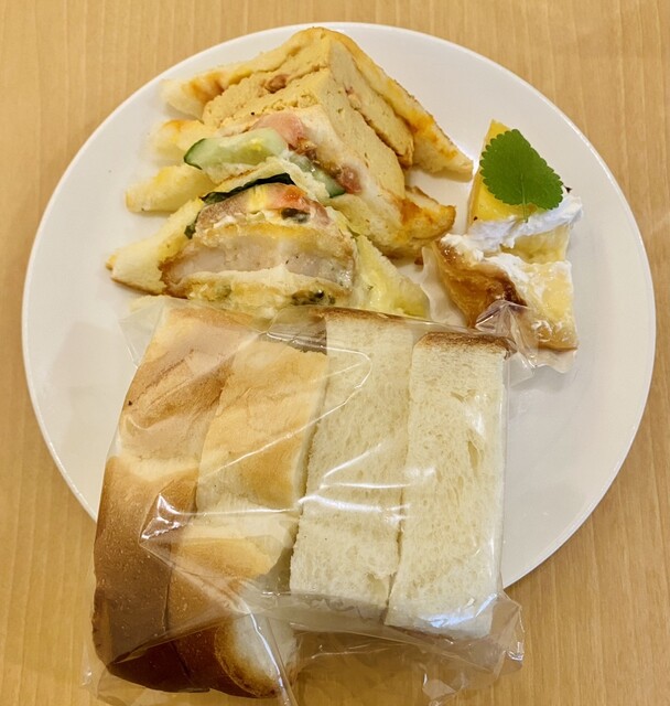 お持ち帰りパン!♡鶏胸肉の香り唐揚げとたっぷり野菜のサンド♡中に挟まれている鶏胸肉はしっとり柔らかく、とてもジューシーでした(´౿`)♡♡食パンの甘みと具材の塩味がとっても良いバランスで美味しかった!