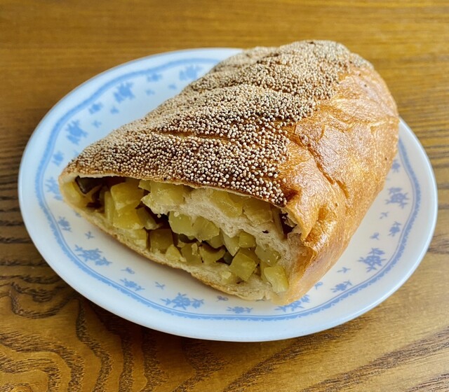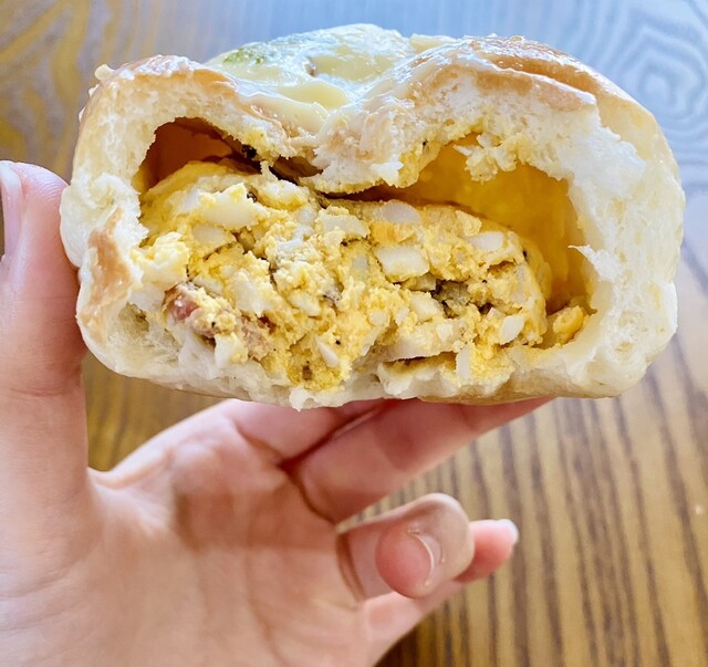 中にはタマゴサラダ、タマネギ、ベーコンがたっぷりと詰まってました!(*/ω\*)♡ こ、これおいしすぎるリピ確定(愛)