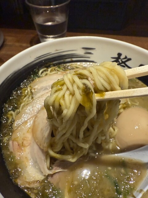 麺は細縮れ麺に、あおさとスープが絡み旨し‼️