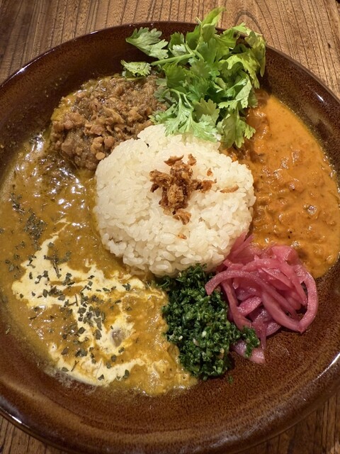 この日も悩みましたが『至福の3種カレーライス』をオーダー。3種の本日のカレーは北海道にんじんとココナッツポークカレーでした。