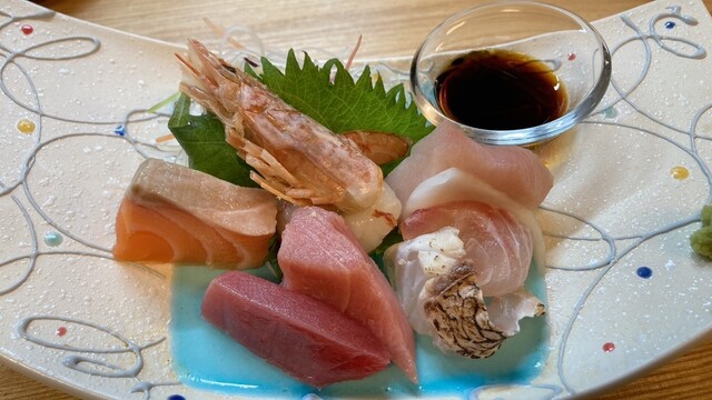 サーモン、赤エビ、マグロ、ブリ。ブリは添えられている千枚漬けと一緒に食べるようとのこと、そのような食べ方は初めてでしたがこれはさっぱりとした味わいにになりナイス!