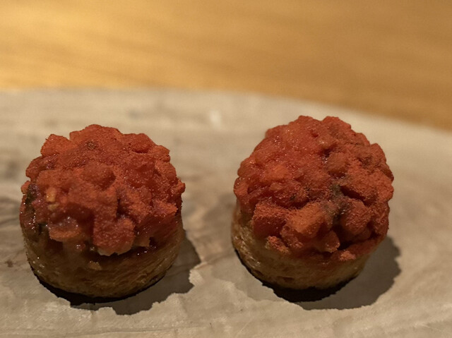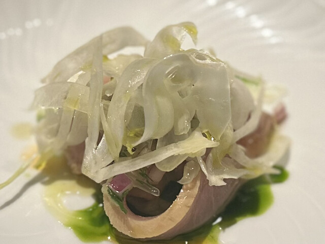 ロゼの発泡酒で乾杯。びっくりするほど香りが良くて期待が高まります。一品目の前に調布の農家さんから差し入れのあったという赤かぶからスタート。素材の甘みを活かした優しい味です。一品目は鯖とトマトのブルスケッタ。生地の軽さと鯖とトマトの調和のバランスが絶妙で見た目も美しく、看板メニューなのでは?と思う一皿です。2品目用のお酒は芋焼酎のお湯割。フワッとした包み込むような優しさの香りと口当たり。お料理はイタリア風のもつ煮込みトリッパ・アッラ・ロマーナ。合わせ方のセンスの良さが光ります。日本酒で新政酒造の水墨2023が登場してテンションのメーターが壊れます。鰤のカルパッチョには檸檬ピールの苦味が効いたソース。めちゃくちゃ美味しい!