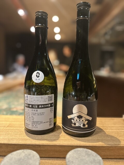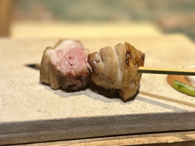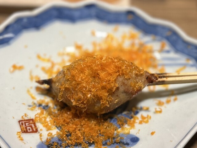 串はハツモト・砂肝・だきみとどれもお肉が大きくて食べ応えがあります。つみれには固形化した卵黄を削ったものがフワッと振りかけてあります。それが熱でとろけていく感じがまた芸術的に旨い!こんな手の込んだことをするのは、料理人の探求心にただただ感動します。コースはこれが最後の串なので追加串をすすめられます。ぜんぶ頼んでみました。ささみ・背肝・振袖・ボンジリとどれも絶品です。お酒は長野県の甍(いらが)銀黒と兵庫県の播州一献 七宝 純米大吟醸。ここに置いてあるお酒はどれもヤバい。