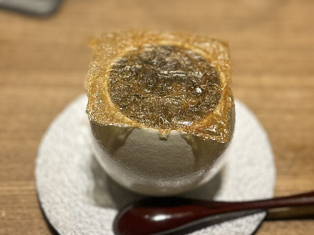 〆も愉しませてくれます。炭火で香ばしく焼いたニラをそぼろご飯に卵をかけて、土鍋で炊いた美味しいごはんです。本当に嬉しくなる美味しさで幸せです。しかもおかわりはお茶漬けにしてくれます。どこまでサイコーなのでしょうか。デザートはわらび餅とプリンが層で重なっています。焼いてあるカラメルをスプーンで崩して食べるのが愉しい。このお店はすぐに予約の取れない名店となります。ご予約は早めにどうぞ。