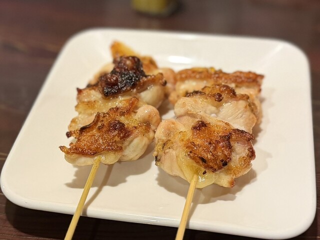 サッポロ生(エーデルピルス)で乾杯。漬け物のレタスの何とも言えない甘みが本当に美味しくてびっくり。前菜三種(レバーペースト・鶏たたき・胸肉刻みとろろ)は生・レアの鶏肉をまずは堪能させてくれます。レバーペーストは味濃いめでビールが進み粒山椒のフレッシュな香りが本当にセンスが良いです。鶏むねの炭火焼は皮目がパリッと焼いてあるのに身はしっとりとレアな仕上がり。軽めに岩塩で整えてあり、歯応えと肉の味わいが芸術のレベルです。