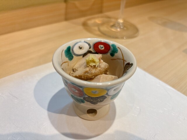 アジは分厚い身で上にあたりネギ(青ネギと生姜)が乗っててにんにくっぽいのに香りがするのが不思議!アジの脂が乗ってて濃厚なお味なのに、ペアリングのワインがスッキリめ。とっても良いペアリングで本当に感動した!