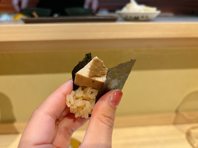 北海道のあん肝で、一口目はわさびと一緒にそのまま、二口目は握りで食べるっていうなかなか珍しい食べ方!