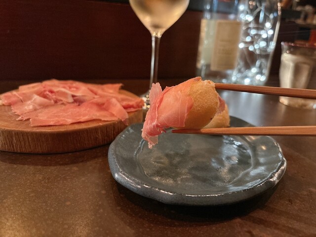 温かいフリットに生ハムを乗せて食べる一皿目。あったかいフリットにのせることで生ハムの脂が溶けだすから贅沢な一口になる!フリットもサクッとした口溶けに生ハムの塩っけがちょうど良かった!残りの生ハムはワインにぴったり〜!
