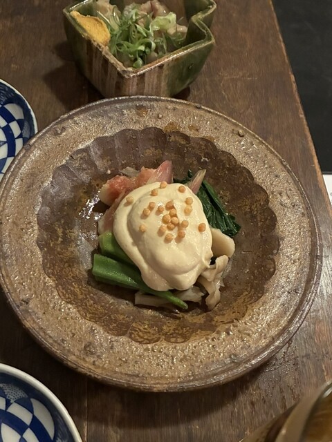 季節野菜の白和えは、オクラと茗荷となんといちぢく!最高✨お出汁が美味しいのでそのままでも充分美味しいですが、この白和えがとってもクリーミーで絶妙なバランス!あられの食感も入ってめちゃくちゃ美味しいです!