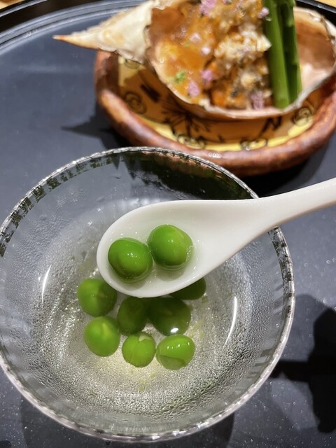 グリンピース・鱧・じゅんさいと季節を感じる食材がカウンターを彩ります。