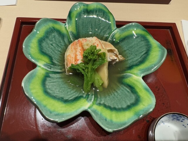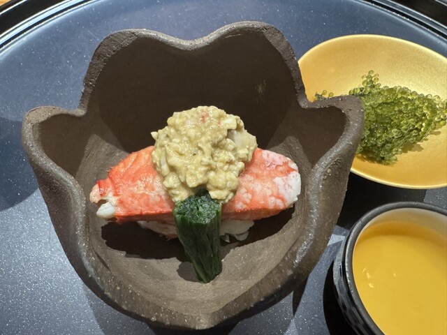 カニ脚の下に、カニの身ほぐしと三つ葉とガリが少し入ってる料理が隠れてたりと、真上からの写真だけではわからない物が・・隠れてる