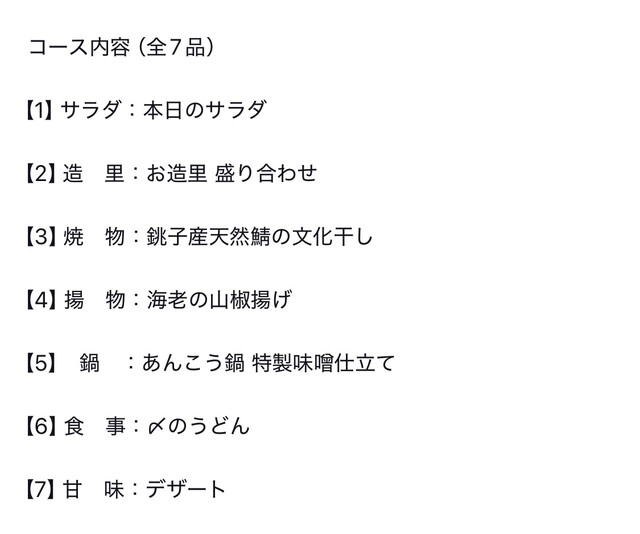 コース料理は添付写真メニューの全部で7品。
