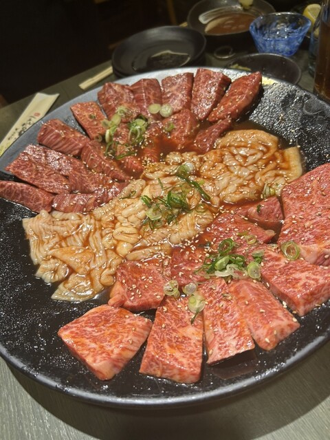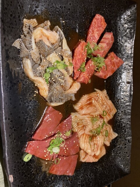 この段階でも大満足なのですが、次はタレの盛り合わせで、上ロースやカルビ、ミノ、ホルモンなどもうたまりません。