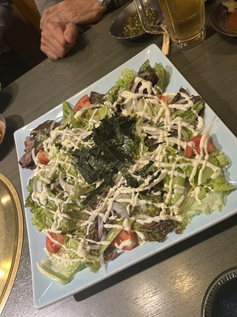 先ずは鉄板のサラダ。焼肉屋さんなのですがサラダが絶品です。ドレッシングも最高。大皿をペロッとたいらげます。