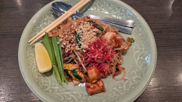 ランチセットではなく、パッタイ(¥1540)をアラカルトで注文。細麺で水分が多く甘めの味付け。卓上調味料のナンプラーと唐辛子をかけるとかなり好みの味になり、夢中で完食しました。