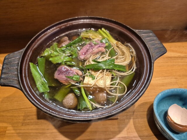 そしてお待ちかねの鴨。最初は炙ったものから頂きます。上品な脂と硬過ぎず軟らか過ぎない身の旨さにお酒の進むこと進むこと。続いて鴨鍋。最初は皿の半分を根付きのセリと葱と一緒に卵を溶いて頂きます。つみれは骨と一緒に挽いているいるためゴリゴリとした食感が人を選ぶかもしれませんが、酒飲みの私は美味しく頂けました。(むしろお酒のためには、もう少し割下が濃いほうが嬉しかった・・・)もちろん身も野菜もとても美味しかったです。