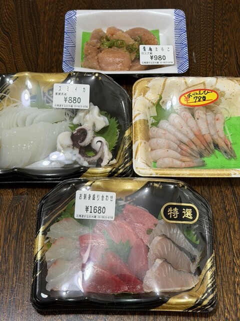 いつもワンオペで切り盛りしているがんばり屋のご店主のオススメで、刺身の盛り合わせ、スミイカ、鬼エビ、青唐辛子たらこを購入。