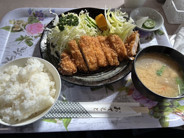 土曜日12時前ひとりで訪店。先客は4組10人。テレビの前の座敷席へ。注文は2回目のとんかつ定食。小説「一次元の挿し木」を聞きながら待つと揚げたてのとんかつ登場。とんかつは言うまでもなく、具沢山の味噌汁が絶品です。とても美味しゅうございました。