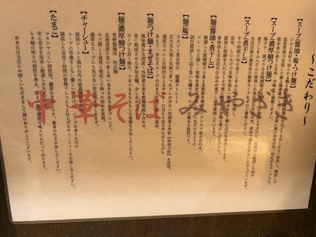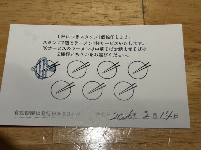 土曜日11時半にひとりで臨場。先客3〜4人、待ちなし。店に入って左手の券売機で魚介香る塩そば(¥950)にした。店員さんに食券をわたすと数分後に着丼。店員さんから丼が熱いのでご注意をとのことだったが本当に超熱い。細いストレート麺に鶏と魚介の塩味スープがよく合う。トッピングの鶏むね肉がとても柔らかい。とても美味しゅうございました。券売機前にあった来店カードで7回スタンプがたまるとラーメン1杯サービスになるらしい。また来てスタンプ貯めよう!
