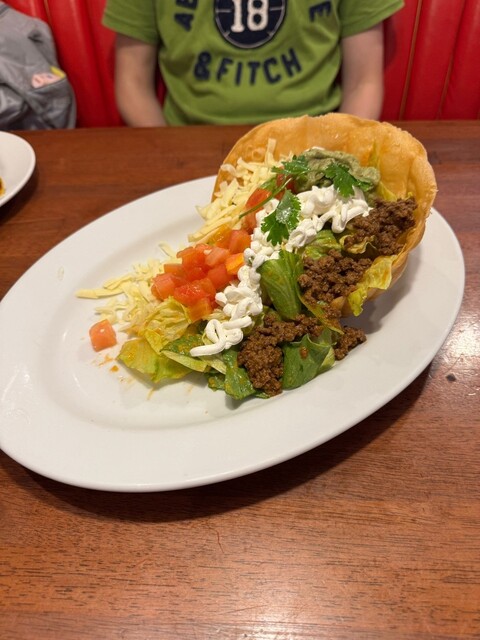 クリスピータコス・メキシカンサラダ・キッズフライドチキンを注文。1FOOD1DRINK制だったのでアイスコーヒーを頼みましたが、ビールにすれば良かった…。