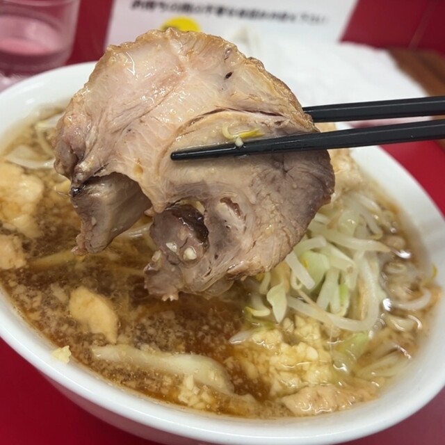 二郎らしいいつものメンバー。特筆した点を挙げるとするならば、やはりチャーシューである。写真では沈んでいたが、つまみあげるとかなりデカい!そんで千切れてしまいそうな程ほろほろな柔らかさ。かなり美味しかったです。