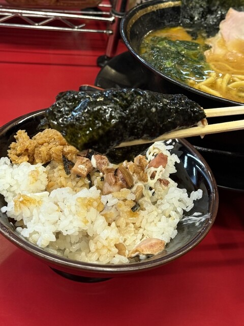 家系にライスは必須。おすすめな食べ方は、『無限にんにく』を追加、マヨネーズをぶっかけて、海苔やチャーシューで巻いてかっくらう!