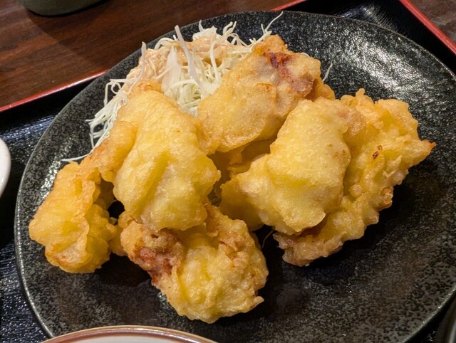 とり天定食は6個のとり天、やっこ、香物、ごはん、みそ汁