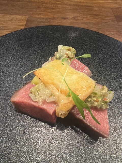 (鳩の肉と、ハートの串焼きを別々に調理されます)私が持ち上げているのが、鳩のハートです。ハートが金色の矢に突き抜かれられてます。センスを感じる一番感動した最高の一品。