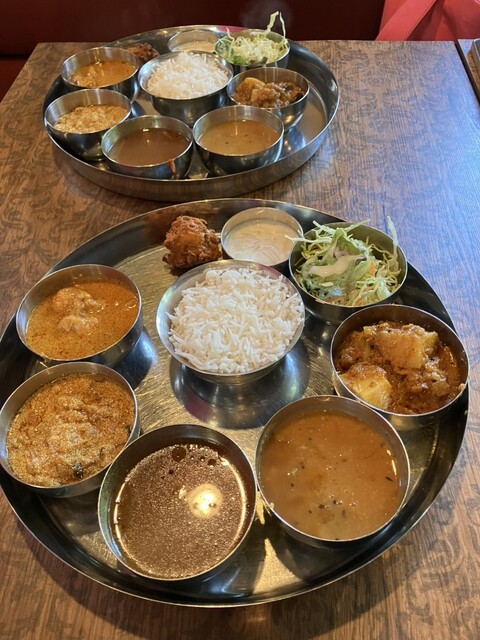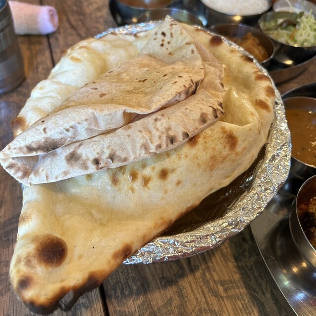 肉、野菜、日替わりカレー、バスマティライスに選べるパンも付いてきます。私がナン、相方がチャパティをたのみました。
