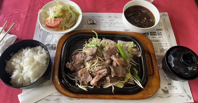 最後に鉄板にのったステーキとポークが運ばれてきました。