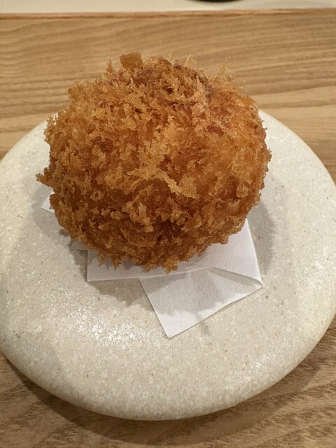 カニクリームコロッケ、これは言うまでもありません~濃厚なクリームの中に蟹の味わいと食感、熱すぎるためハフハフしながらいただきますが、火傷してもこの熱いタイミングでの食事は逃せません
