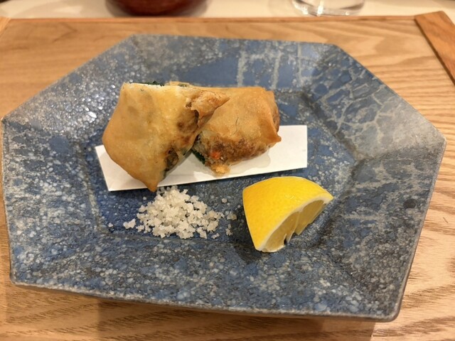 そして、蟹の春巻きが出ます~刺身も焼物もいただいていますが、これはまた素晴らしい!揚げ物ですが、日本酒にもワインにもビールにも合いそうなあっさりしていてこってりしているなんとも言えない美味さです