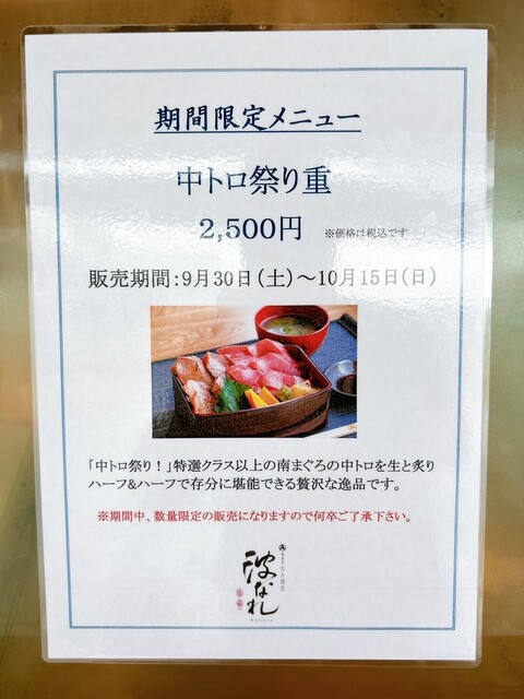 店頭に掲示されていた9/30〜10/15までの期間限定メニュー予告、中トロ祭り重も美味しそう。ミナミマグロ中トロの生と炙りがハーフ&ハーフでたっぷり乗せるそうですよ♫生はもちろんですがこの炙りが美味いのよ。