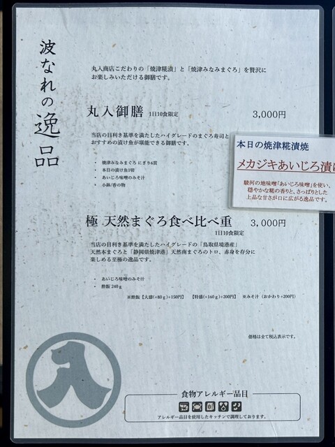 前回は10食限定の特選天然ミナミマグロ重を堪能させて頂きましたが、今回は別のこれまた10食限定メニュー、丸入御膳を頂きました。焼津港丸入商店ブランドの目利きしたハイグレードのまぐろ寿司とおすすめの漬け魚が楽しめる御膳です。