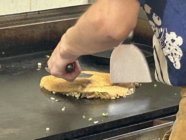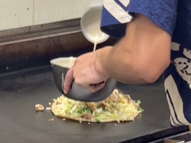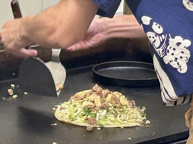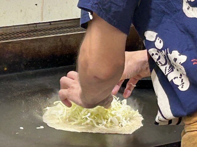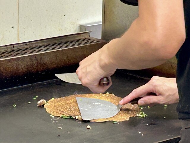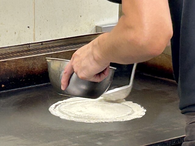 重みのあるつなぎ生地がしっかり回し掛けられていて、それをテコで押さえながら焼くから、薄いんだけど中はトロリとしたなかなかずっしりとした食べ応え(^^)