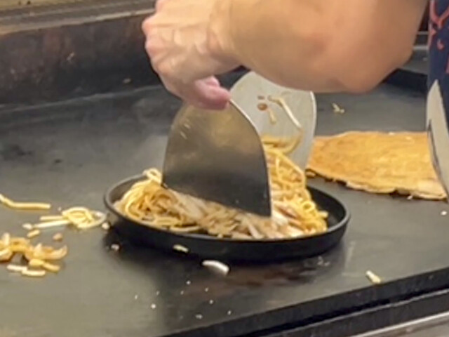 鉄板上で細かく刻まれた麺や具材、ご飯が混ぜ合わされながらパラパラに焼き上がっていく。。そして味の決め手はやっぱりばらソース♡