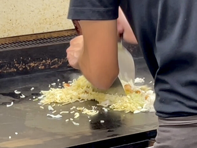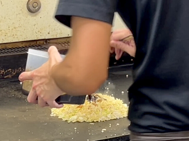 両手のテコを立てて麵もご飯もカカカカカッと細かく刻んでいきます。途中で投入した千切りキャベツも同様!