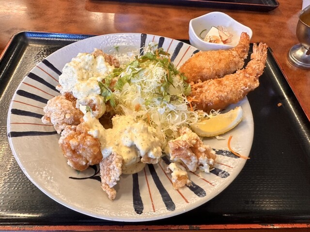 エビフライチキン南蛮をたのんだのですが、無料のカレーにエビをトッピングして、定食プラスエビフライカレーのできあがりです!!