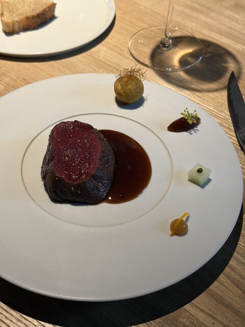 メインの鹿肉は、脂肪の少ないお肉をここまで柔らかくジューシーに仕上げた技術に脱帽。4種類の付け合わせとソースで、ひと口ごとに異なる表情が楽しめました。