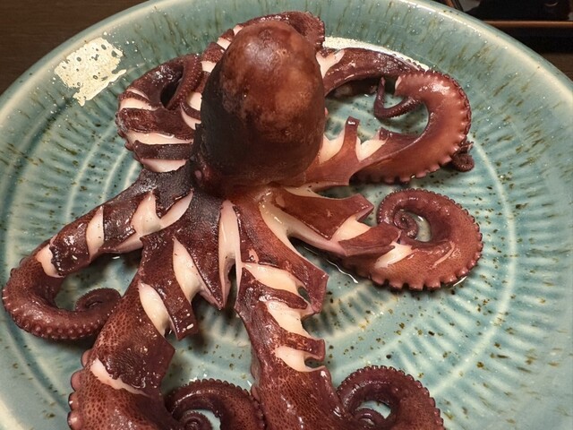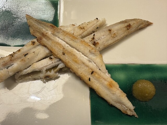 続いてカマスの塩焼きは皮がパリッと香ばしく身はふっくら。滅茶苦茶美味しい!蛸の茹でたものは1匹丸々で、鋏で切りながら食べます。穴子の白焼きは塩とワサビ。大アサリはプリッとジューシー、フグの天ぷらは絶品。どれも味が濃く、家族で「すっごい!」を連発してました。