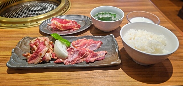 まもなく、上カルビ、サラダ、ワカメスープ、ライスが到着。